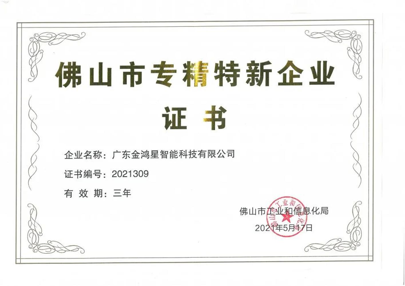 2021年5月26日,金鴻星智能科技有限公司榮獲佛山市工業(yè)和信息化局頒發(fā)的“專精特新”企業(yè)榮譽證書。這是上級政府部門對金鴻星科技在市場經(jīng)營管理以及產(chǎn)品科技創(chuàng)新等方面實力的再次肯定。