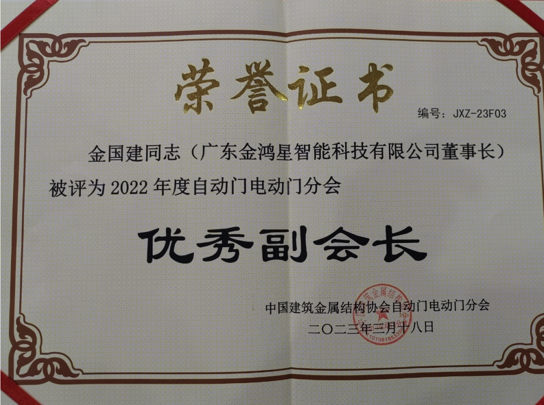 盛典現(xiàn)場,廣東金鴻星智能科技有限公司董事長金國建先生被聘為中國建筑金屬結(jié)構(gòu)協(xié)會技術(shù)顧問并斬獲多項殊榮,其中獲評「2022年度自動門電動門分會優(yōu)秀副會長」、「戶外人行智能平開門參編單位」、「自動門電動門行業(yè)特別奉獻獎」,金鴻星董事長金國建榮膺「2022年度行業(yè)會刊優(yōu)秀撰稿人」稱號,這些殊榮充分肯定了金鴻星在中國自動門電動門行業(yè)的卓越地位及深厚影響力。