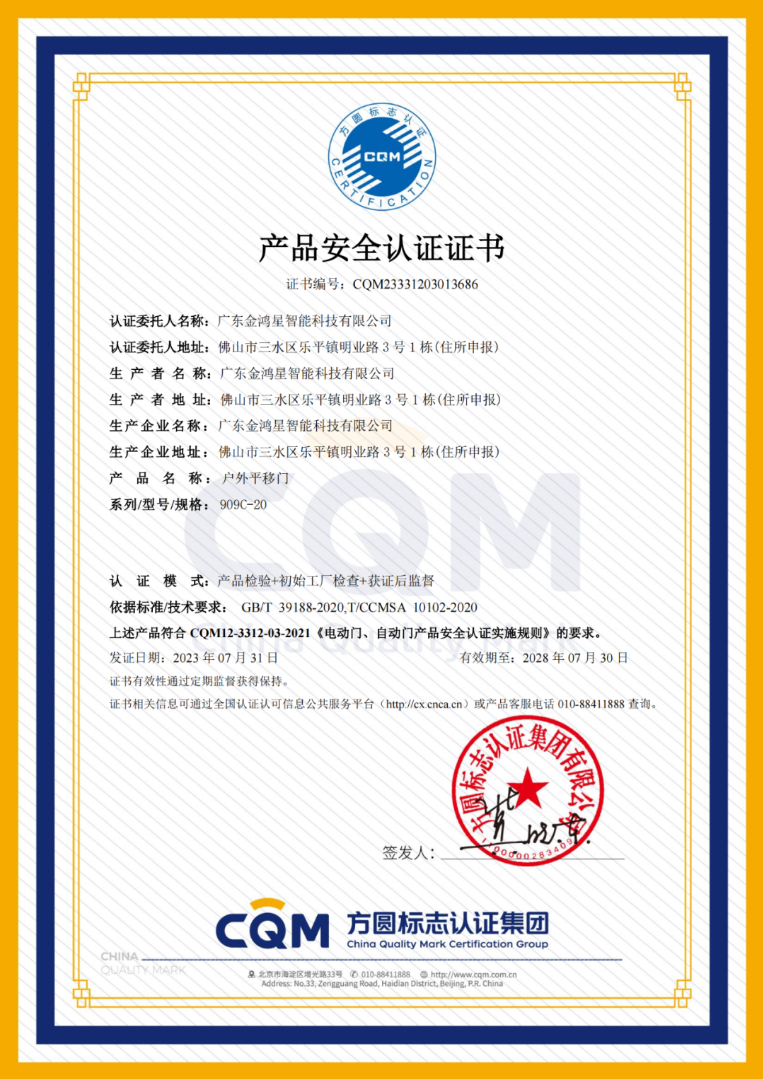 金鴻星產品經(jīng)過一系列嚴格的審查及評審,順利獲得戶外平移門以及電動伸縮門“產品安全認證”證書,不僅彰顯了金鴻星在行業(yè)內的地位,更證實了金鴻星在產品安全上不斷精進的實踐與成果。金鴻星始終以產品安全與智能的發(fā)展為前提,不斷對產品的性能進行持續(xù)升級,致力于研發(fā)高品質、安全與智能的放心產品,引領行業(yè)高質量高標準健康發(fā)展,給每一位選擇金鴻星的客戶都能買的放心,用的安心。
